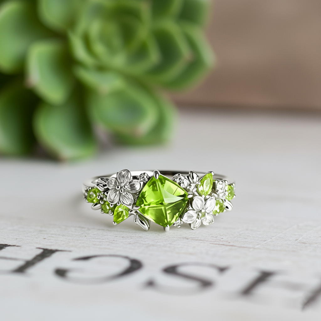 Jasmine Peridot Ring - Floral Green Moissanite Accents