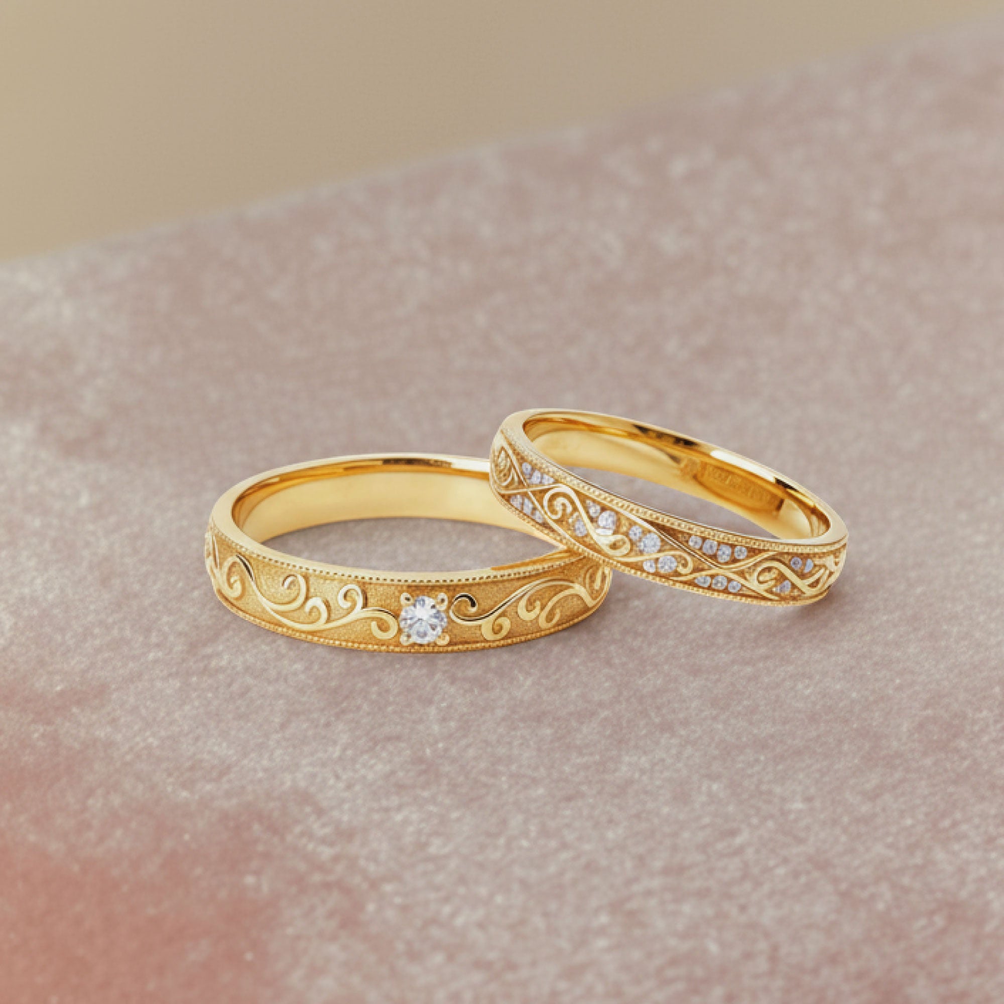 Golden Vow | Filigree Scrollwork Matching Wedding Band Set 2pcs - Verona