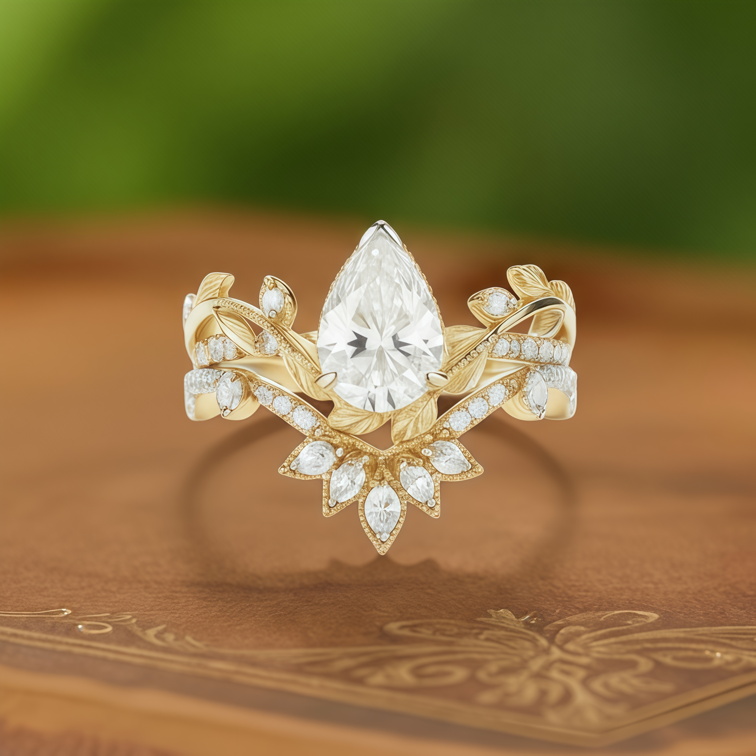 Woodland Radiance | Pear Moissanite & Marquise Pave Leaf Crown Statement Ring in Yellow Gold - Golden Aura Solitaire